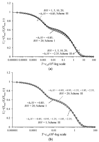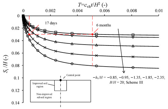 Figure 9 presents a suite of responses of history settlement for the position located at the top surface of soil along the centreline. Results from the analyses in schemes I and III are included, with varying B/H and −hv/H. It is clear that, two piecewise responses were obvious, because of different consolidation rate in the region of improved soil and bottom soil. All curves merged into an identical trend, which fell adjacent to the response of the case with B/H = 20. It was consistent with the observation described above. Under larger B/H, the influence of seepage flow can be neglected for the central region of improved soil zone, so the settlement responses from schemes I and III were almost same. But under lower B/H, the seepage flow resulted in a reduction of effective consolidation pressure, and thus a lower value in the final settlement Smax even at the central region, which led to a faster consolidation response and close to a non-seepage response.
