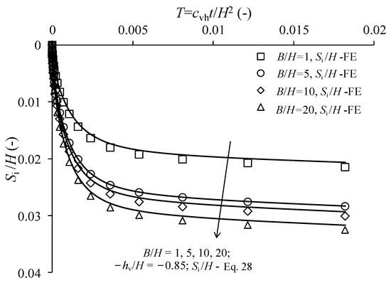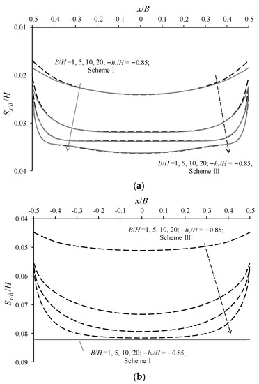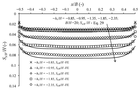 Figure 15 reports the normalized non-uniform settlement Sx/B/H calculated by Equation (29) for B/H = 20 under different consolidation degrees (1 − Us). From the comparison of the corresponding results from FE analyses in scheme III, good agreement can be found, so the proof of validity for Equation (29) was confirmed.