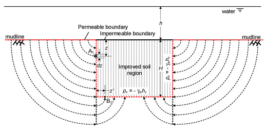 With the retrospection of suction-induced seepage mechanism discussed previously, the simplified flow paths were established as shown in Figure 12. For a given depth z (see Point A1) along the lateral boundary of improved soil region, the flow path was assumed to be a quarter of circle with a length of πz/2, and for a given position z′ (≤H/2) away from the corner along the bottom boundary (see point B1), the flow path was assumed to be a combination of a quarter of circle with a length of π(z + z′)/2 and another quarter of circle with a length of πz′/2. Here, the region of occurring seepage was artificially confined within the width of 3H/2 aside the improved soil zone. However, the flow paths can be used to calculate a reference discharge along both lateral and bottom boundaries, with two satisfactory assumptions (1) the soil is fully saturated; (2) the seepage is stable state flow conforming to Darcy’s law.