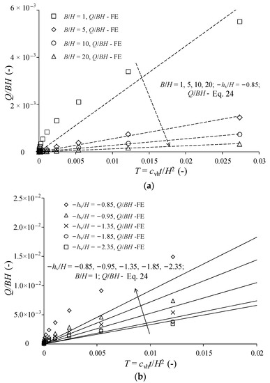 Figure 13 shows the comparison of seepage discharges computed by Equations (21)–(23) obtained from FE analyses in scheme II. The total seepage discharge Q/BH are included for comparison with different B/H and −hv/H. The reasonable prediction can be observed in general, with some deviations mainly in the earlier seepage, which was due to the assumption of stable-state flow.