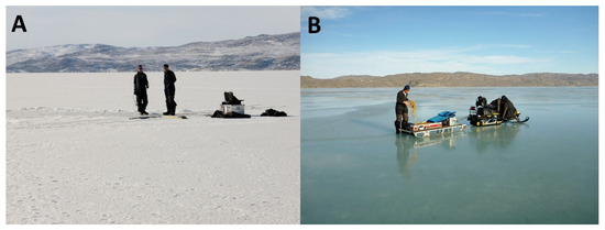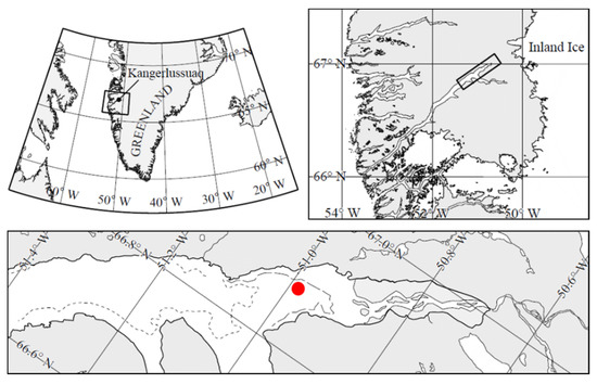 Our observations were made from 12 to 19 March 2013 at 66°56.780 N; 50°52.853 W, in Kangerlussuaq (Figure 1), a 180 km long, narrow (1–5 km) Arctic fjord located on the Arctic Circle on the west coast of Greenland, about 25 km from the Greenland ice sheet. It consists of a relatively shallow (30 to 40 m depth) outer part that connects with the open ocean and a deep-water inner part with depths up to 280 m [26]. Water depth at the sampling site was ca. 130 m. The tide is diurnal with a maximum tidal range of about 2–4 m [27]. The area has a continental climate with low average winter temperatures of −15 to −25 °C and low precipitation of ca. 5 mm per month during December–July (www.dmi.dk (accessed on 1 July 2021)). The fjord is ice-covered between October and early June to a thickness of about 0.5–1.0 m.