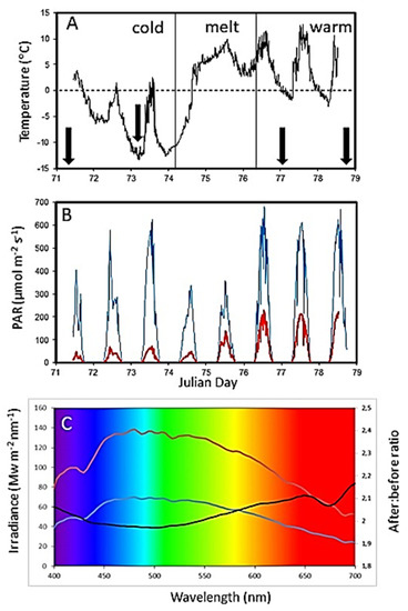 There are generally two approaches for studying effects of snowmelt on the ice algae community: first, manipulative field experiments involving complete or partial artificial snow removal, following effects from a subsequent time series [12,20], and second, measurement of selected parameters such as biomass or primary production as a function of natural variation in snow depth over space or time [21,22,23]. The limitations of these two approaches for understanding large-scale, rapid increases in irradiance in response to sudden snowmelt are evident. For logistical reasons, most snow-clearing experiments can only treat relatively small areas (a few square metres) and are not accompanied by realistic changes in air and sea ice temperatures during weather events, and therefore they may not accurately mimic whole-ecosystem algal responses during snowmelt events. Natural gradients, on the other hand, allow algae to acclimate to the prevailing irradiance and do not provide the sudden photoinhibitory stress driven by rapid snowmelt. Regrettably, researchers have few opportunities to study photobiological responses to snowmelt during the large-scale snowmelt events that sea ice algae often experience in nature.