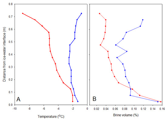 Figure 4. Ice temperature (A) and brine volume (B) profiles during the cold (pre-snowmelt, Day 73, red line) and warm (post-snowmelt, Day 77, blue line) phases of the experiment. Values are means at each depth from two cores.