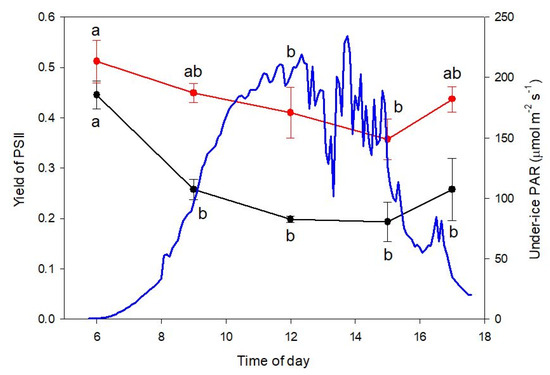 Figure 6. Diel cycles in yield of PSII for sea ice algae on Day 78 after loss of snow cover on fjord. Black line shows ΦPSII measured immediately after collection by Imaging-PAM fluorometry, red line shows ΦPSII_max after subsequent thawing in dark measured by Phyto-PAM fluorometry. Mean values ± 1SD, n = 3. Significant differences between time points at p < 0.05 (repeated-measures ANOVA, post hoc Bonferroni tests) shown for each curve by different letters adjacent to symbols. Blue line shows continuous monitoring of irradiance as photosynthetically active radiation (PAR) immediately under ice.