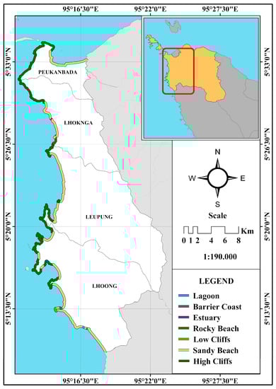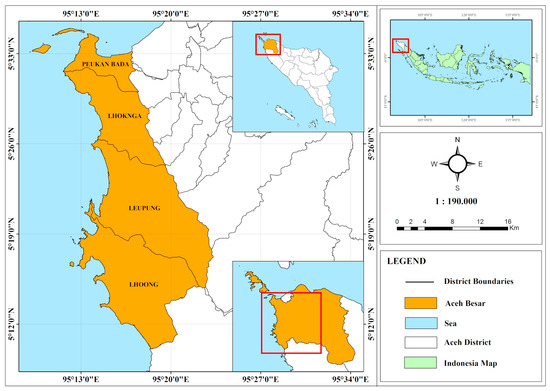 Aceh Besar district is located in the Aceh province, tip of Sumatra, Indonesia, which is divided into two coastal locations, namely the north coast of Aceh Besar and the west coast of Aceh Besar. The sea water area is 2796 km2 and Aceh Besar has a coastline of 344 km [1]. This coastal area is greatly influenced by natural phenomena, the surrounding environment and anthropogenic features [2,3]. Rukin [4] stated that coastal areas have unique landscapes and socio-economic characteristics that affect human activities, and these human activities usually create long-term effects in the form of coastal changes if they are not managed properly [5,6]. Socio-economic activities carried out by humans and geo-oceanographic processes can result in morphological changes on the coast [7,8]. Since the coastal environment is very vulnerable and sensitive to change, a careful assessment of the critical issues and shortcomings is required before the implementation of any intervention or strategy involving the coastal system [9,10].