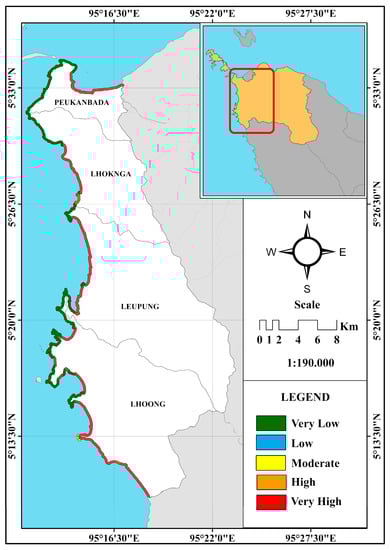 The map of the vulnerability level and the quantitative percentage of vulnerability based on the coastal geomorphology of the area are shown in Figure 3 and Table 4. The results show that almost all areas in the northern part of Aceh Besar district have very high vulnerability. Figure 3 also shows that the sub-districts of Leupung and Lhoong are also areas with very high vulnerability compared to other areas because, geomorphologically, these areas are dominated by sandy beaches. Meanwhile, Peukanbada and Lhoong sub-districts have very low vulnerability because almost half of the area is located in high-cliffed coastal locations.