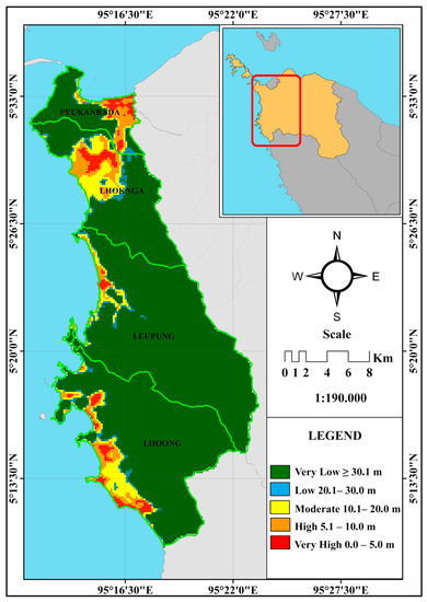 All four sub-districts have a very high level of vulnerability, with 7.94% of Peukanbada sub-district being very high vulnerability, followed by 6.22% of Leupung sub-district, 4.94% of Lhoong sub-district, and 1.50% of Lhoknga sub-district. The sub-districts that have very low vulnerability are Lhoong (19.10%), Peukanbada (11.15%), Leupung (6.01%), and Lhoknga (4.72%). Geomorphologically, areas with very high vulnerability generally have sandy beaches with a gentle coastal slope. Meanwhile, the geomorphology of areas with very low levels of vulnerability tends to include high elevations and cliffs.
