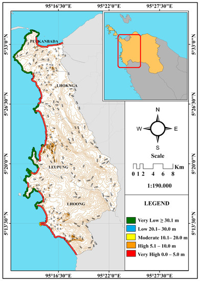 The results of the coastal elevation analysis can identify and predict areas that will be lost due to the impact of future sea level rises [38]. Rahadiati et al. [38] estimated that, in the next 100 years, sea level rises will increase by between 0.5 and 5 m. In addition, Hamuna et al. [39] stated that, when high waves occur in a low coastal elevation, water will enter the land, causing water inundation. Therefore, the coast, which has a low elevation between 0 and 5 m above sea level, has a very high vulnerability in the event of sea level rises and large waves [40,41].