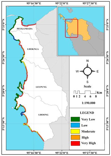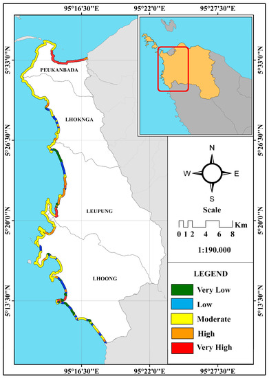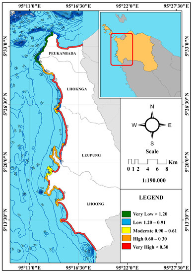 The west coast of Aceh Besar constitutes a vulnerable environment and requires special attention to preserve its ecosystem and the human activities that occur within it. Many studies have been devoted to analyzing the main factors influencing coastal vulnerability as part of ecosystem conservation. The most frequently and commonly used approach is the coastal vulnerability index (CVI). This approach takes into account all relevant variables that characterize the coastal environment in relation to forcing actions, morphological characteristics, and socio-economic, ecological and cultural aspects [26]. Therefore, the morphological characteristics method is one of the approaches used in our assessment of the coastal vulnerability of the west coast of Aceh Besar.