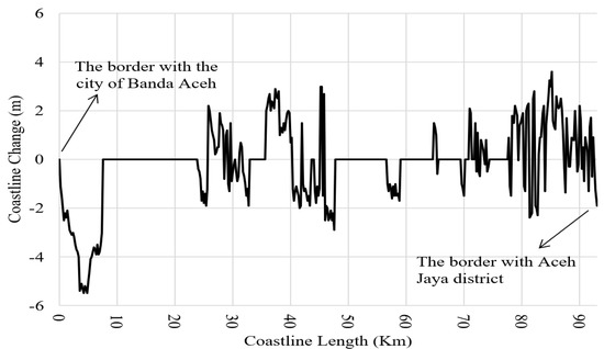 Activities that occur in coastal areas on land and at sea greatly influence changes in the coastline, in the form of either accretion or erosion [36]. The results of the shoreline change analysis using Landsat OLI imagery from 2015 to 2019 are shown in Figure 7 and Table 7. These data indicate that the overall study area experienced an average erosion of −3.34 m across 9.8 km (10.51%) of the total length of the study area, which is categorized as having very high vulnerability. Furthermore, the 10.4 m area (11.16%) experienced an average erosion of −1.45 m, which was categorized as high vulnerability. Additionally, the 56.2 km area (60.31%) was categorized as being moderately vulnerable, with changes in the coastline between −1 and 1 m. Furthermore, the level of erosion in the 7.2 km area (7.73%) is −0.59 m, while the level of accretion in the 5.4 km area (5.79%) is 0.63 m. In total, 43.6 km (46.78%) of the length of the coastline has not changed because this comprises areas in which cliffs and rocky beaches are present. The areas that possess low vulnerability have an accretion of +1.55 m and a length of 10.4 km (11.16%). Meanwhile, areas with very low vulnerability experienced an accretion of +2.54 m ha and possessed a length of 6.4 km (6.86%).