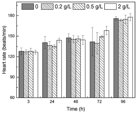 The heart rate of the larvae in the control group and 0.2, 0.5, and 2 g/L PAC-MC groups was measured (Figure 1). The results showed that as the larvae grew, their heart rate increased with time. The heart rate increased from 128 beats/min at 3 h to 176 beats/min at 96 h. The heart rates of larvae in the three PAC-MC concentration groups at each time point were not significantly different from those of the control group (p > 0.05), which showed that the used concentration range of clay did not affect the heart rate of newly hatched larvae.