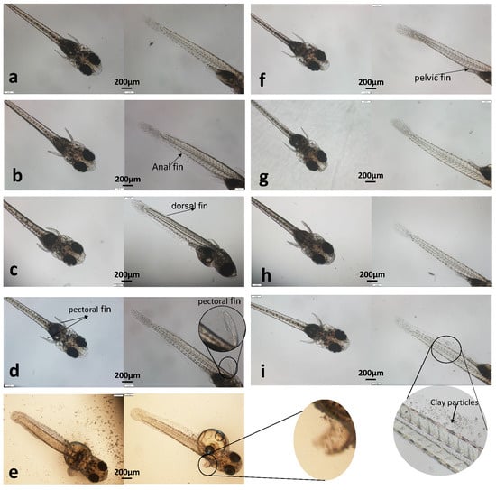 After the 96-h experiment, the total length of the newly hatched larvae was measured. The total lengths of the larvae in the 0, 0.2, 0.5, and 2 g/L groups were 3.41 ± 0.04 mm, 3.29 ± 0.12 mm, 3.31 ± 0.25 mm, and 3.52 ± 0.18 mm, respectively. The statistical analysis results showed that there was no significant difference in larval body length (p > 0.05) between the modified clay groups and the control group (Figure S2).
