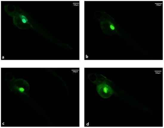 ROS content in newly hatched larvae of medaka. (a–d) Level of ROS in larvae after the addition of 0, 0.2, 0.5, and 2 g/L PAC-MC, respectively, for 6 h.