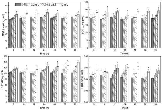 Many pollutants may produce toxicity associated with oxidative stress. Reactive oxygen species (ROS) can cause enzyme inactivation, lipid peroxidation (LPOX), DNA damage, and ultimately, cell death [28]. Antioxidant enzymes are one of the defensive systems that inhibit the formation of oxyradical, in which SOD plays a key antioxidant role, and it exists in almost all aerobic organisms examined [29]. CAT can promote the removal of hydrogen peroxide and metabolize hydrogen peroxide into molecular oxygen and water. Peroxidases (POD) are enzymes that reduce a variety of peroxides to their corresponding alcohols [30]. MDA is a commonly used parameter that reflects lipid peroxidation.