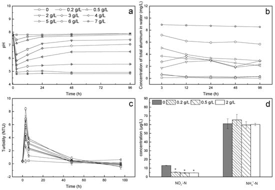 Changes in the water quality parameters with time after the addition of PAC-MC. (a–c) pH, total aluminum content, and turbidity changes over time. (d) Contents of NO2−-N and NH4+-N in each group at 96 h. Mean ± SD; ANOVA, Tukey; * significant difference compared with control at p < 0.05.
