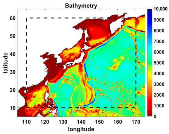 The western North Pacific (WNP) area as defined with a 5° enlarged domain. The bathymetry and shoreline over the WNP region are from the GEBCO_2019 grid and the GSHHG WNP region domain. In depth scale, 0 for the surface and 10,000 for the bottom.
