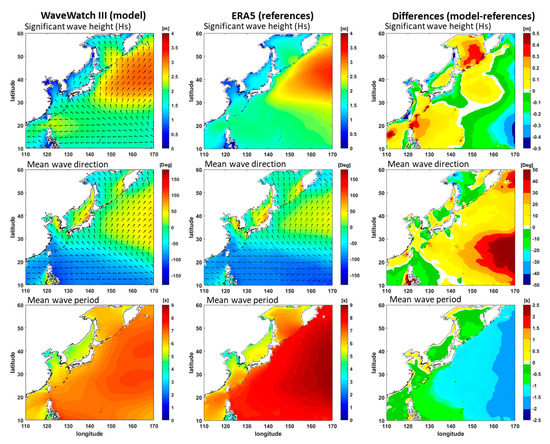 Generally, wave directions have small differences between the model and the reference. Waves from the simulation propagate in a more clockwise direction than the waves in the reference, particularly in the eastern part of the domain. Positive differences indicate that the wave direction in the model is shifted more in the clockwise direction, while negative values indicate the opposite. The angle differences are not wide, approximately 10°–50° at each grid. For an easier comparison, black vector arrows were placed on the graph. The reference shows a mean wave period of 8 s in the WNP, but some parts of the domain have a wave period of 5 s, particularly in the Japan/East Sea region. Obstacles and different seabed features can influence the wave period. The model produces shorter periods, with a range of 0.5–2 s, than the reference. Considering the validation results, the WWIII model settings can be used further to simulate future wave projections.