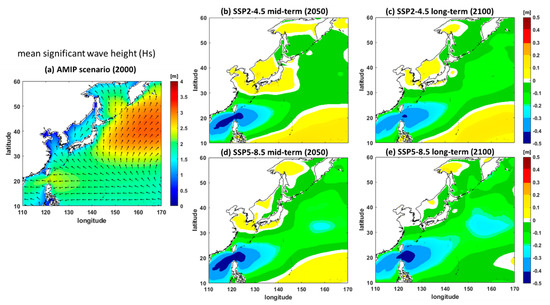 Mean significant wave height (Hs in m) results for (a) the AMIP scenario result for 2000 and the differences between the results of future scenarios and the AMIP scenario: (b) SSP2-4.5 medium-term, (c) SSP2-4.5 long-term, (d) SSP5-8.5 medium-term, and (e) SSP5-8.5 long-term scenarios.