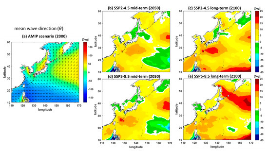 Mean wave direction ( in degrees) results for (a) the AMIP scenario result for 2000 and the differences between the results of future scenarios and the AMIP scenario: (b) SSP2-4.5 medium-term, (c) SSP2-4.5 long-term, (d) SSP5-8.5 medium-term, and (e) SSP5-8.5 long-term scenarios.