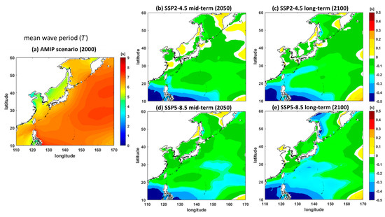 Mean wave period ( in seconds) results for (a) the AMIP scenario result for 2000 and the differences between the results of future scenarios and the AMIP scenario: (b) SSP2-4.5 medium-term, (c) SSP2-4.5 long-term, (d) SSP5-8.5 medium-term, and (e) SSP5-8.5 long-term scenarios.