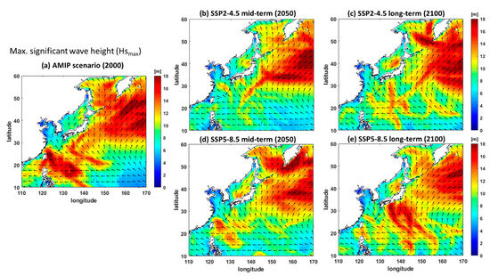 Annual maximum significant wave height (max. Hs in m) results: (a) AMIP scenario result for 2000, (b) SSP2-4.5 medium-term, (c) SSP2-4.5 long-term, (d) SSP5-8.5 medium-term, and (e) SSP5-8.5 long-term scenarios.