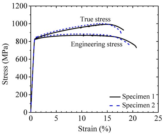 The material used in this paper was a Ti-6Al-4V ELI alloy, which was cut from a forged then rolled plate, parallel to the rolling direction. The chemical composition is shown in Table 1. The average tensile stress was 879 MPa and the yield strength was 831 MPa, which were obtained from two specimens with a gauge length of 30 mm and diameter of 5 mm. The stress and strain curve is illustrated in Figure 1. The microstructure of the material perpendicular to the specimen axis consisted of approximately equiaxed α-phase and lamellar βtran, as shown in Figure 2.