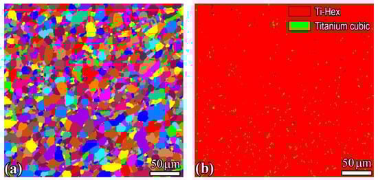 Microstructure of the Ti-6Al-4V ELI alloy. (a) EBSD grain map and (b) EBSD phase map corresponding to (a).