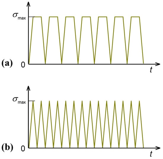 Schematics of loading waveforms. (a) Dwell fatigue loading; (b) Conventional fatigue loading.