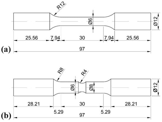 Shapes and dimensions of specimens under dwell fatigue and conventional fatigue tests (in mm). (a) Smooth specimen; (b) specimen with a circumferential notch.