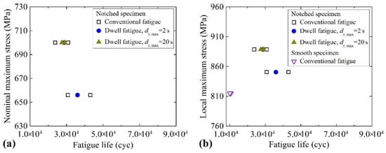 Comparison of fatigue performance between dwell fatigue test and conventional fatigue test for notched specimens. (a) Nominal maximums stress and fatigue life; (b) local maximum stress and fatigue life, which is also compared with the conventional fatigue life of the smooth specimen.