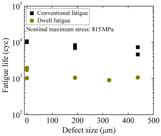 Figure 6 shows the variation of the fatigue life with the defect size of the defective specimens under dwell fatigue and conventional fatigue testing. In Figure 6, the nominal maximum stress for the defective specimen is defined as the nominal maximum stress of the smooth specimen under identical loading conditions, i.e., the defect was not considered for the calculation of the nominal maximum stress. The defect size was taken as the square root of the projection area of the defect perpendicular to the principal stress direction [25], and was measured from the SEM image of the fracture surface for the defect induced failure or the cross-section of the specimen not failed from the defect by the Image-Pro Plus software. It is seen in Figure 6 that the defect had an influence on the fatigue life under conventional fatigue testing. The specimen with the bigger defect showed a lower fatigue life, similar to that for the effect of surface artificial defects on the fatigue life of steels [26,27,28]. While the dwell fatigue life is independent of the defect size. In fact, all the defective specimens did not fail from the defect under dwell fatigue testing in comparison with those that the fatigue crack initiated from the defect for all the defective specimens under conventional fatigue testing. This indicates that the dwell fatigue is not sensitive to the defect compared to conventional fatigue. Figure 6 also indicates that the dwell of the maximum stress reduced the fatigue life of the defective specimen.