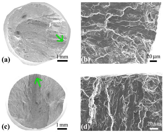 Morphologies of fracture surface of failed specimens at σmax = 815 MPa and dt,max = 120 s under dwell fatigue testing. (a,b): Smooth specimen with Nf = 1724 cycles; (c,d): Defective specimen with Nf = 1066 cycles. (b,d) are magnified images of the regions where the arrows point to in (a,c), respectively.