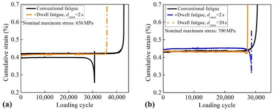 Variation in cumulative maximum strain with the number of loading cycles for notched specimens under conventional fatigue and dwell fatigue tests. (a): fatigue test at the nominal maximum stress σmax = 656 MPa; (b): fatigue test at the nominal maximum stress σmax = 700 MPa.
