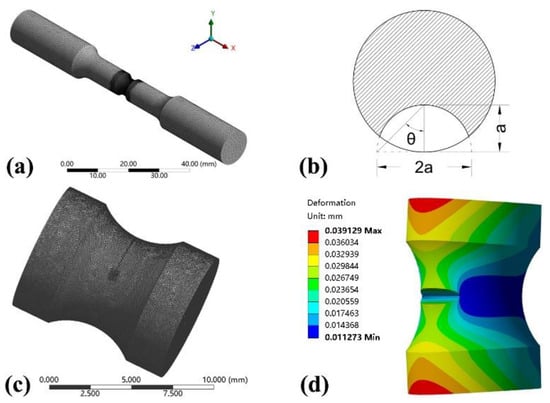 (a): Model of the specimen with the a crack in the plane of the smallest section of the specimen; (b): Sketch map of the semi-elliptical shape crack in (a); (c): Enlarged view of the 10 mm part containing the crack a = 2.0 mm in (a); (d): Deformation distribution of the 10 mm part in (c) under a tensile load of 18,539 N along the axis direction of the specimen.