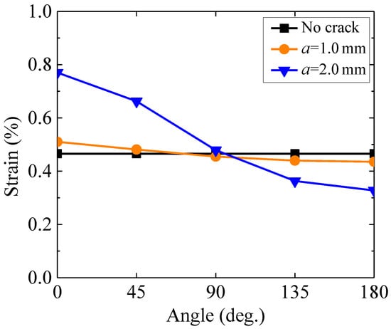 The finite element analysis was also employed for a further explanation of the results in Figure 10, in which a semi-elliptical shape crack with 0.2 mm thickness was considered [31]. The finite element model and the shape of the semi-elliptical crack are shown in Figure 11a,b, respectively. The tetrahedral elements were taken, and refinement meshes (0.1 mm in size) were used for the region around the crack. The tensile load of 18,539 N was applied at the two ends of the specimen, which corresponded to the nominal stress of 656 MPa at the notch root of the specimen. The stress and strain relation of specimen two in Figure 1 was used for calculation. Figure 11d shows the deformation distribution of the 10 mm part of the specimen containing the crack. It is seen that the deformation of the 10 mm part of the specimen containing the crack (i.e., the strain measured by the extensometer) was nonuniform, which is related to the position relative to the crack. For the crack region, the deformation was relatively big, while for no crack region, the deformation was relatively small. Figure 12 shows the variation of the strain of the 10 mm part containing the crack with the angle θ of the projection of the position of extensometer on the smallest plane relative to the center line of the crack shown in Figure 11b. It is seen that the strain decreased when the angle of the position of extensometer relative to the center line of the crack increased from 0 to 180°. Figure 12 indicates that the cumulative strain measured at different position was different due to the nonuniform deformation caused by the existence of the crack. Figure 12 also indicates that the difference of the cumulative strain measured at a different position was related to the crack size. When the crack was very small, this difference was negligible.