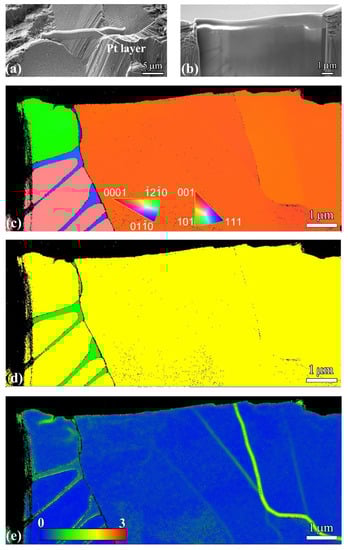 EBSD observation of extracted cross-section sample of the facet in location 2 in Figure 9i. (a): SEM image for FIB location; (b): SEM image of extracted cross-section sample; (c–e): EBSD results of the sample in (b), (c) is inverse pole figure map, (d) is phase map, in which the yellow and the green colors denote the alpha phase and the beta phase, respectively, (e) is the KAM map.