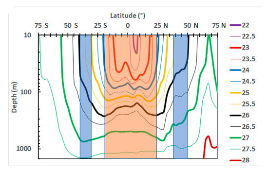 Isopycnals in the world ocean: ( = potential density) is represented with 0.5 kg intervals. Zonal blue bands intersect the gyres in their part furthest from the equator; the zonal pink band intersects the gyres in their part closest to the equator [22].