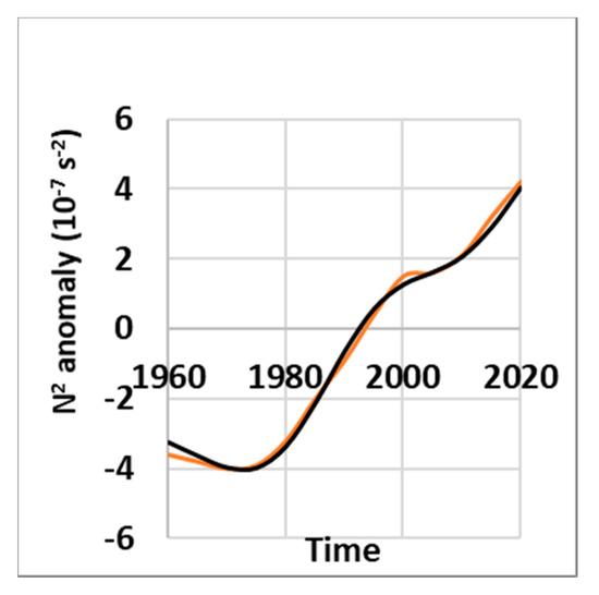 The prominent role of the five subtropical gyres is clearly highlighted in Figure 1. Indeed, the variations in potential density and are deepest within a zonal band framed by the limit closest to the pole of the subtropical gyres (within the blue bands) and the ocean stratification increase for the upper 150 m occurs within the pink band, reaching almost 5 10−7 s−2 yr−1 [22].