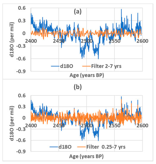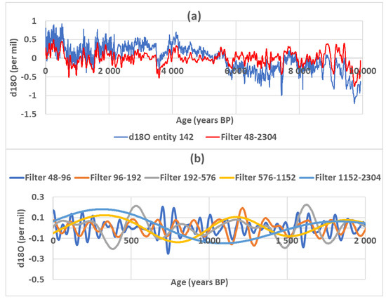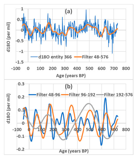 In Figure 3, the speleothem (entity 366) represents the calcite δ18O composition in the speleothem versus the age, a 780-year annually resolved speleothem from south Oman. Data are filtered in bands characteristic of the first three subharmonic modes. The amplitudes of the three components are comparable (Figure 3b). The raw data from speleothem can be reconstructed adequately if it is filtered in the broad band 48–576 years when the short periods are ignored (Figure 3a).