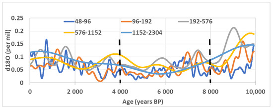 In Figure 4, the speleothem (entity 142) represents the calcite δ18O composition in the speleothem versus the age, from a mid-European paleosite, covering the period of 11 ka up to the present. Data are filtered in bands characteristic of the first five subharmonic modes. As shown in Figure 4a, correct reconstruction of the speleothem would require the addition of higher subharmonic modes (low frequencies are missing). However, this information could not be used within this study because too few speleothems would be suitable for subharmonic numbers greater than 5.