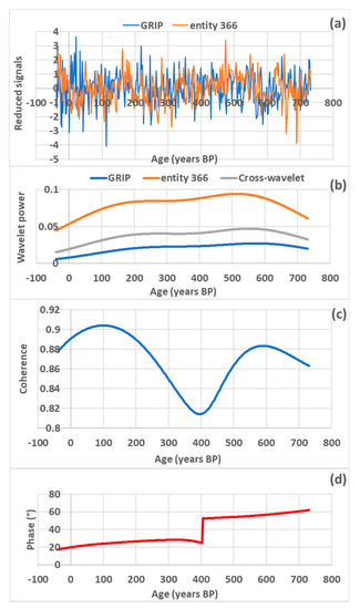 Coherence and phase difference, within the band 192–576 years, of the speleothem (entity 366) relative to the δ18O composition from GRIP ice core records. Signals are reduced (divided by the standard deviation). (a) Raw signals; (b) wavelet power spectra and cross-wavelet spectrum; (c) coherence; (d) phase difference.