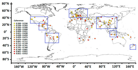 The seven regions selected from sites for which the climatic response according to the different subharmonic modes is observed. They are Western and Central Europe (15° W, 40° E) × (65° N, 40° N), Asia (66° E, 124° E) × (43° N, 10° N), Southeast Asia (106° E, 123° E) × (5° N, 15° S), New Zealand (163° E, 180° E) × (38° S, 50° S), Southern North America (125° W, 75° W) × (42° N, 26° N), Central America (100° W, 76° W) × (25° N, 7° N), and Central South America (82° W, 42° W) × (3° S, 33° S). The coherence between the speleothems and the paleorecord higher than 0.5 is represented for the subharmonic mode (average period = 128 years). The paleorecord is the δ18O composition in the ice core records available in the Greenland Ice Core Project (GRIP).