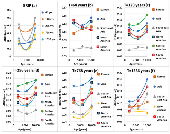 Figure 9e is like the previous one, with the absence of Central America but the appearance of New Zealand whose amplitude is exceptionally low at nearly 0.06 per mil δ18O (25 mm/yr). By contrast, the value reached by North America is high at the beginning of the Holocene.