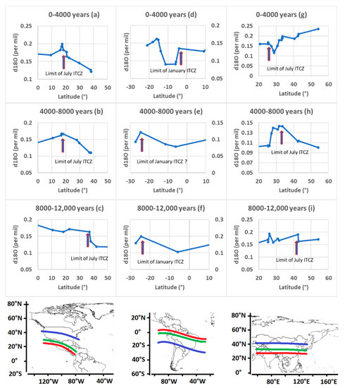 Figure 10 shows the amplitude of rainfall oscillation (δ18O per mil) versus the latitudes from which the location of summer ITCZ are deduced. In North America, the summer ITCZ was positioned over 37° N at 10,000 years BP (Figure 10c) to shift to 21° N at 2000 years BP (Figure 10a), the same location of the ITCZ in mid-Holocene, albeit less accurate (Figure 10b). In South America, the summer ITCZ was 25° S at 10,000 years BP (Figure 10f) with a shift to 4° S at 2000 years BP (Figure 10d). Here again, the intermediate value lacks precision due to the scarcity of speleothems. As for Asia, the summer ITCZ was placed over 42° N at 10,000 years BP (Figure 10i) with a shift to 25° N at 2000 years BP (Figure 10g). However, equatorward migration of the summer ITCZ was slower than in the previous two cases as it was still ongoing in the mid-Holocene when the summer ITCZ was located over 34° N.