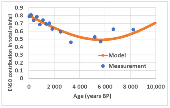 ENSO contribution to precipitation deduced from speleothems and the model—that is, δ18O concentration in the GRIP ice core filtered within the band 9216–73,728 Ka (union of subharmonic modes , , and ), and multiplied by a constant to produce an adimenstional variable. This constant is a negative real number adjusted so that the quadratic sum of the deviations between the measurements and the model is minimal.