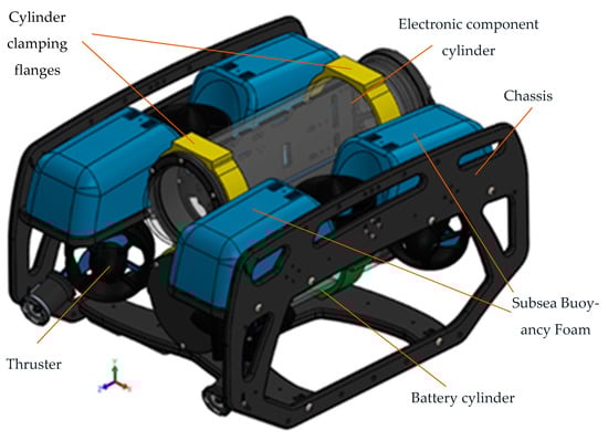 The ROV developed in the Center of Excellence in Robotics and Autonomous Systems (CERAS) allows the performance of specific activities up to the maximum depth of 100 m (Figure 1) []. It can transport command-and-control equipment, video cameras and sensors, sonar, an actuator system, and performing elements (e.g., articulated arms for gripping) [,,].