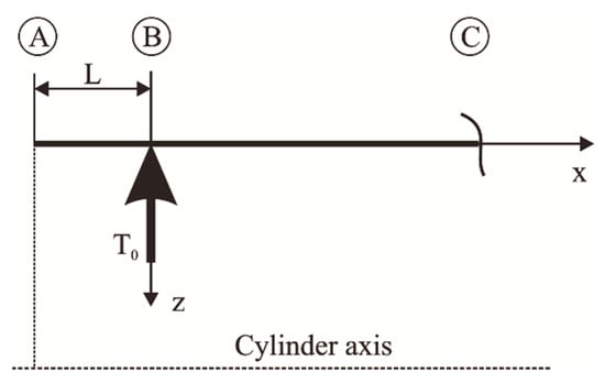 For the situation in which the curved cylindrical plate is loaded by a shear force and a bending torque in a section from the base of the cylinder (Figure 4), the force distributed on the lateral surface, , is null.