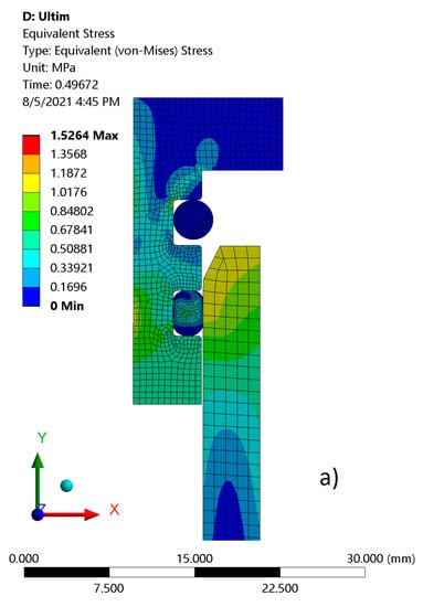 In Figure 6a,b, the equivalent tensions are presented in two positions of the cylinder: when it covers the first gasket and when sealing is performed. The gasket has a circular section with a diameter of 3.5 mm; the G plexiglass cylinder has an outer diameter of 110 mm and the inner one of 100 mm. It can be noted that the maximum tension from the cylinder is 1.77 MPa, a value that does not exceed the breaking tension indicated by the manufacturer of 72 MPa.