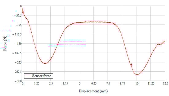 For oil mounting, it is observed that the axial mounting force decreases. In the graph in Figure 11, we can distinguish how it reaches two end points, which are corresponding to the maximum settlement of the two gaskets between the walls of the channels in the cover and the cylinder body. For the first gasket coming into contact, a force of 230.7 N is reached at a lid displacement of 2.04 mm, and for the second gasket, a force of 276.5 N corresponds to a displacement of 10.06 mm.