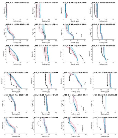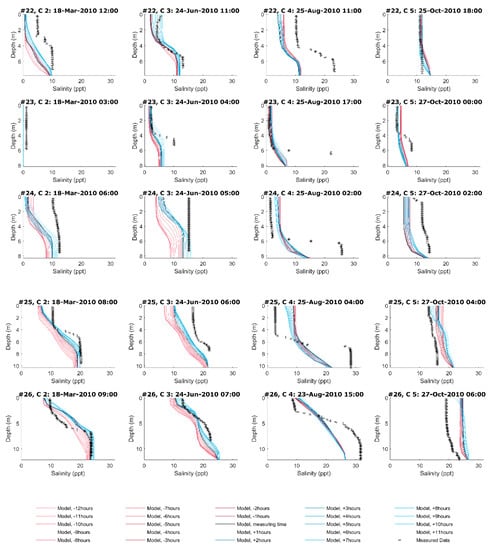 Figure 2 presents the salinity profiles at 11 locations, measured during four field campaigns carried out during 2010 (March, June, August, and October), as well as the comparison with model results. The profiles obtained with the numerical model during the days of the measurements are presented hourly, from 12 h before the survey until 12 h after it (i.e., 24 model profiles are shown for each measured profile). The collected salinity profiles showed a wide range of stratification conditions, from vertical mixing to strong stratification conditions. For example, the profiles collected during March 2010 showed a mainly vertical salinity stratification, except for those measured at stations 16, 23, and 24. For the data collected during June 2010, some profiles showed quite uniform conditions (stations 16, 18, 19, 20, and 24), while others showed marked stratification (stations 17, 21, 22, 23, 25, and 26). For the data collected during August 2010, the data showed a strong stratification condition at all measuring stations, while the last campaign during October 2010 showed mostly mixed vertical salinity conditions, with some weak stratification at only some of the measuring stations. These data clearly indicate the great spatial and temporal variability of the vertical salinity distribution in the salinity front area. Comparing measured and simulated instantaneous vertical salinity profiles is very exigent. Figure 2 shows that the model was able to produce both mixed and stratified conditions at most stations. Although the modelled salinity values showed differences from those measured, in most cases, the vertical distribution was reasonably well represented.